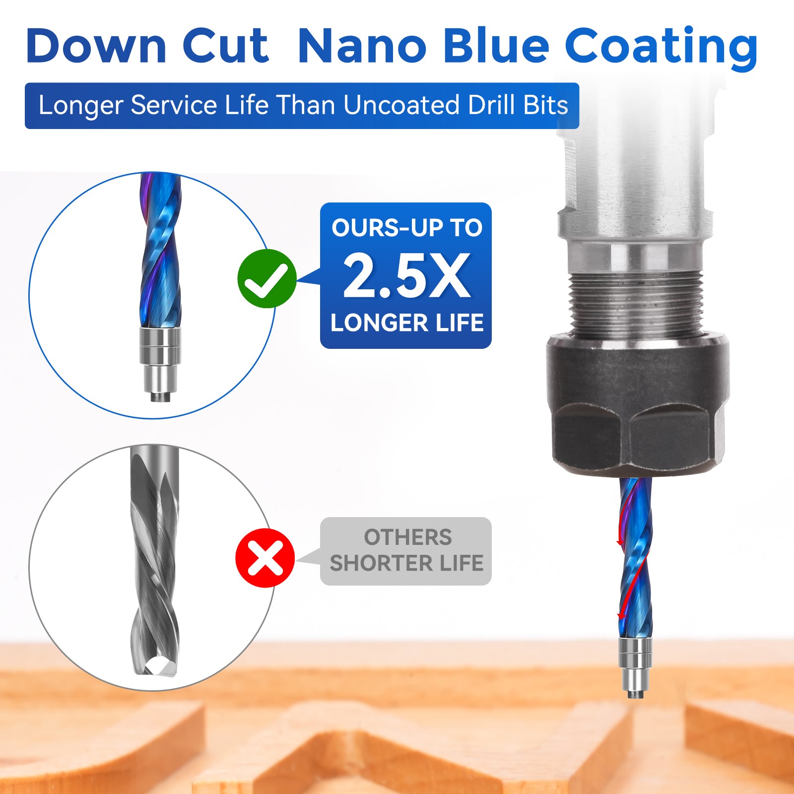 Revêtement : Le revêtement Nano Blue est très dur et résistant à la chaleur, permettant au tranchant de l'outil de conserver un tranchant et une lubrification critiques. Durée de vie 2,5 fois plus longue par rapport aux forets non revêtus.