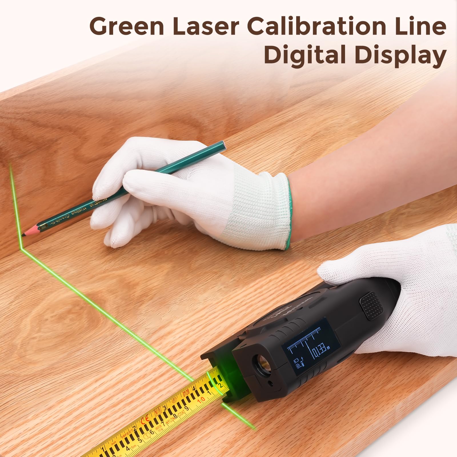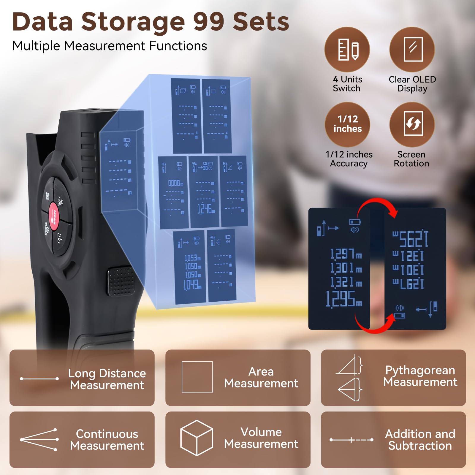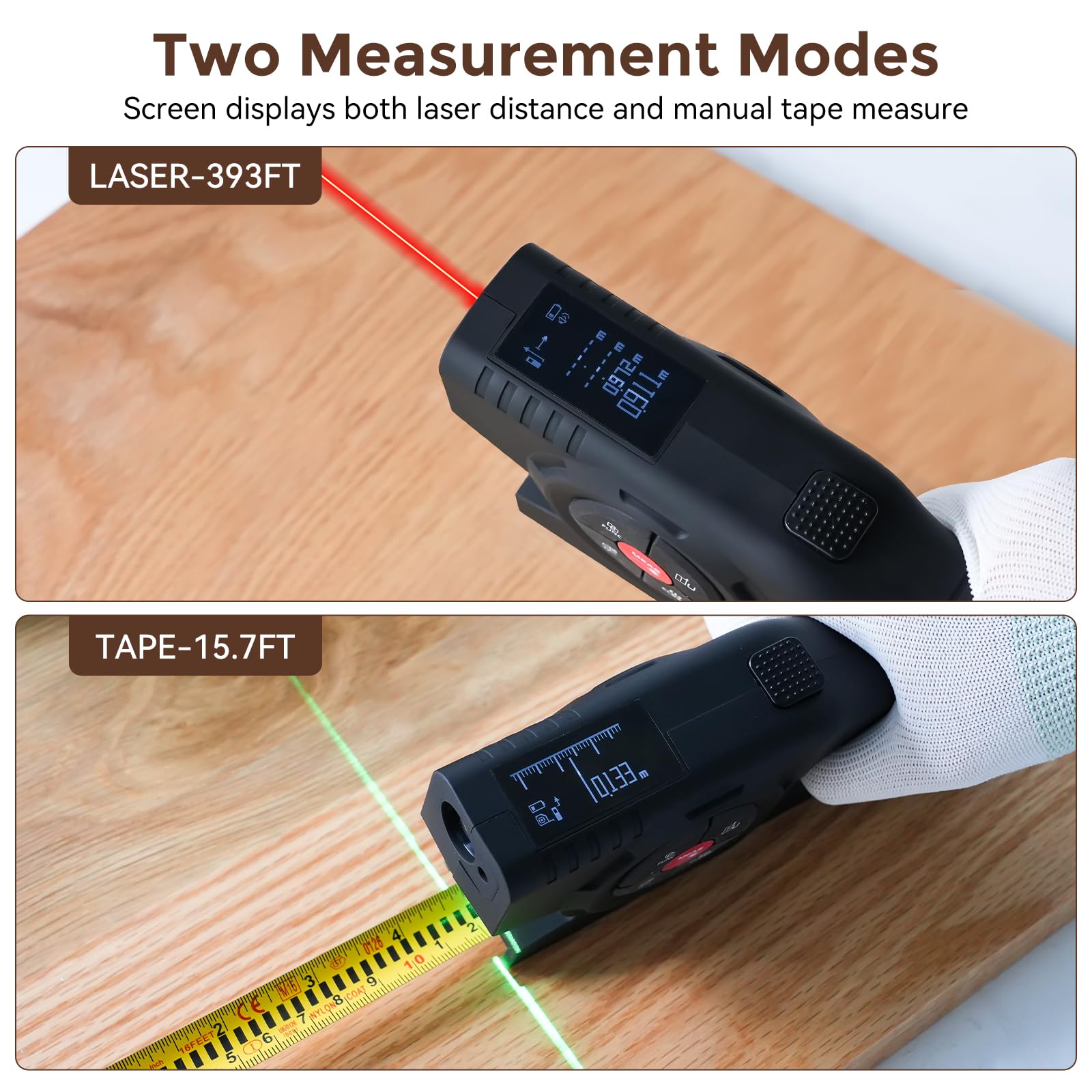 【3-IN-1 lézeres mérőeszköz】 Mérőeszközünk kétoldalas méretű, 16 láb hosszúságú mérőszalagot és 393 láb hosszúságú lézeres mérőszalagot kombinál, amely II. osztályú lézerrel (620-690 nm) van felszerelve a ±1/12 hüvelykes pontos mérésekhez.
