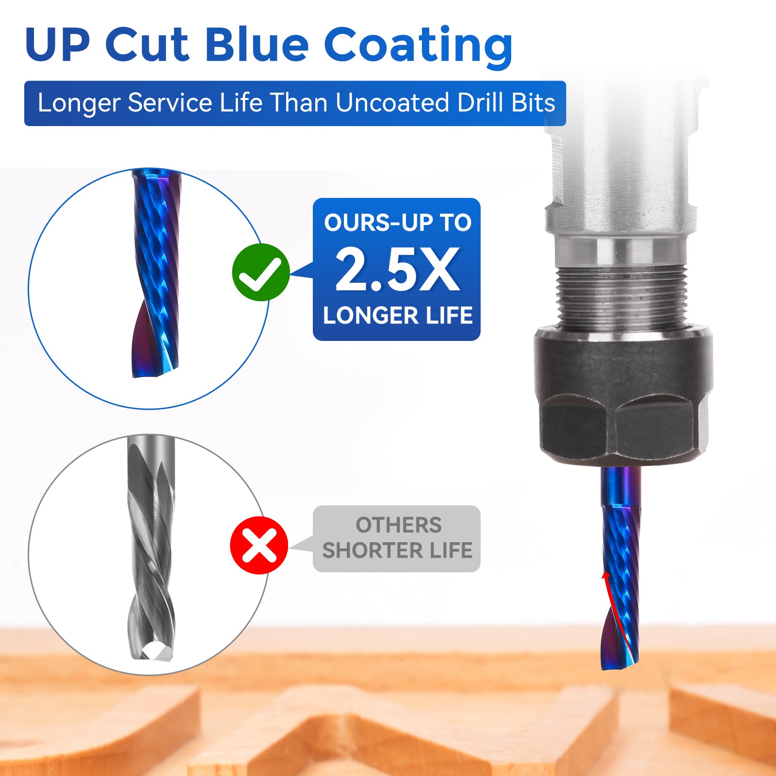 Coating: The solid carbide router bit adopts nano blue coating, which has high hardness and heat resistance, and the service life of the new coating is 2.5 times longer than that of the uncoated one, making the drill bit durable, sharp and efficient, smooth and stable.